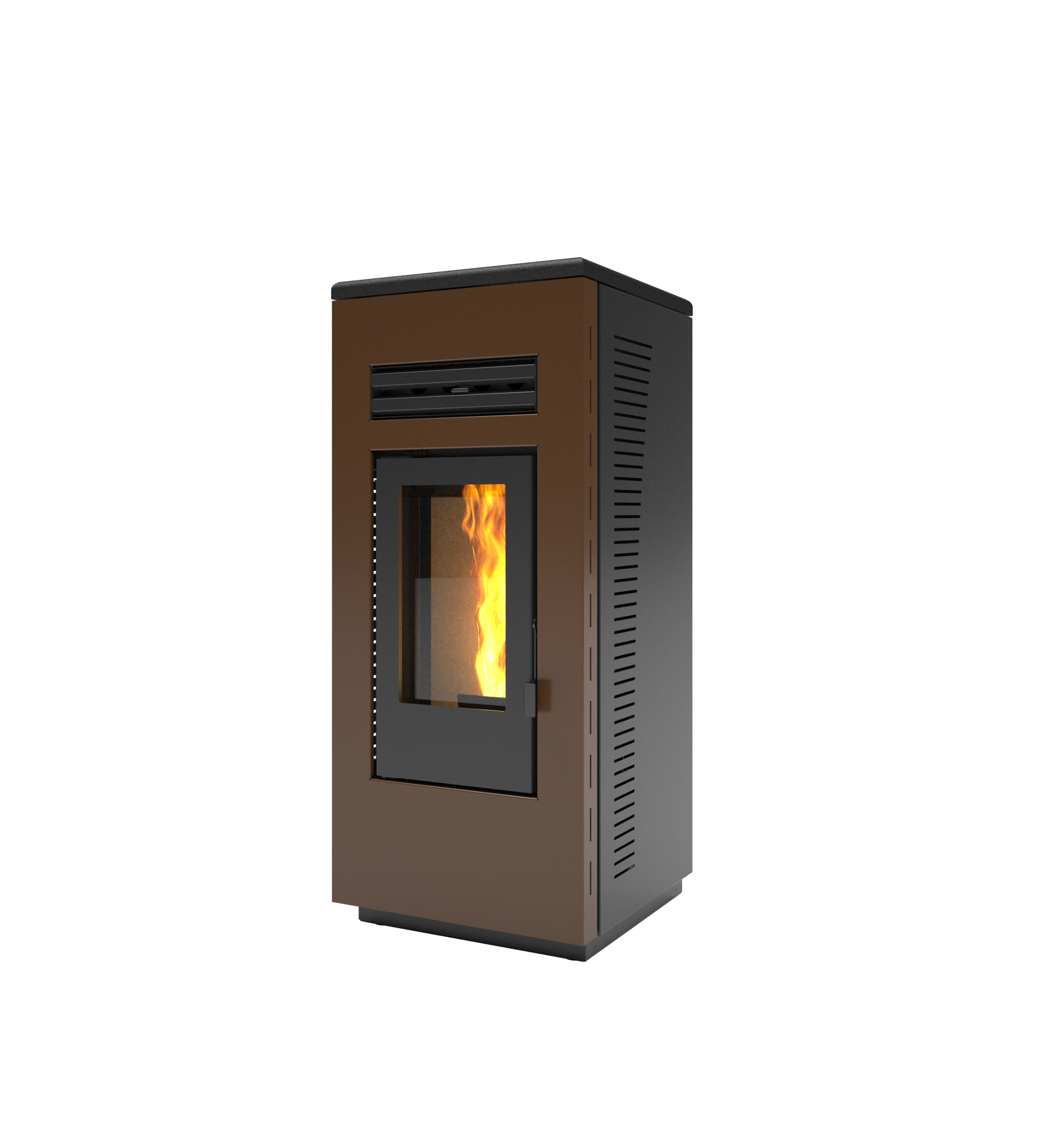 Stufa a pellet luna 10kw bronzo. Corpo macchina realizzato con materiali di alto spessore. Gguarnizione porta in acciaio di fibra di vetro / Top in ghisa ad alto spessore. Camera combustione in vermiculite