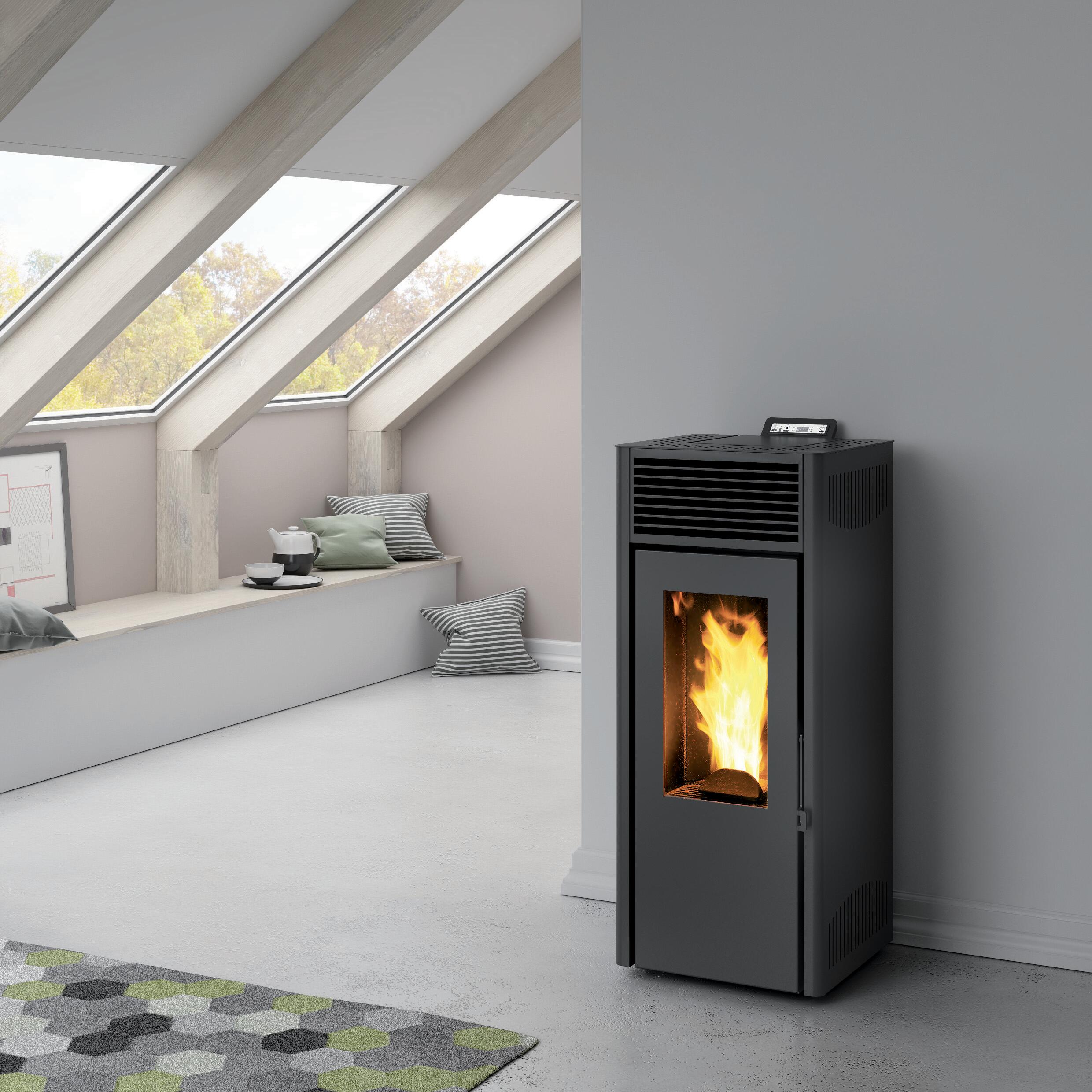 A pellet nero. scarico fumi posteriore e contrale, bruciatore e schienale in ghisa, prima accensione non obbligatoria, top in tinta con la stufa
