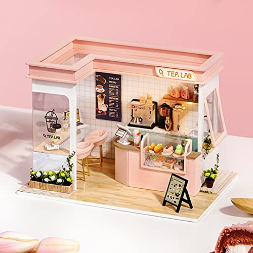 Ins Style Kit modello casa delle bambole in miniatura con mobili,kit fai da te per casa delle bambole in legno con copertura antipolvere,kit per la costruzione di case creativa (laboratorio del tè)