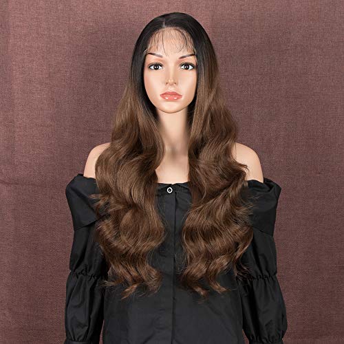 Style Icon - Parrucca da donna, in fibra sintetica resistente al calore, 66 cm, con lace front da 10 x 10 cm, cuoio capelluto simulato, con capelli mossi castani sfumati, riga libera