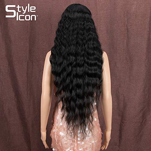 Style Icon, Parrucche sintetiche ondulate lunghe 76 cm, parte centrale profonda, capelli più piccoli, con pizzo da 3,8 x 10,2 scalpo in e naturale, parrucca nera donna fibra resistente al calore