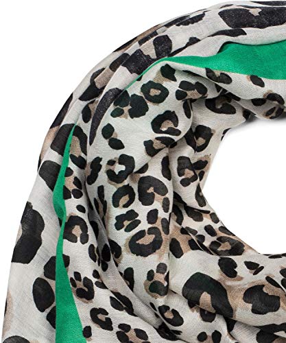 StyleBREAKER Sciarpa da donna con stampa di macchie di leopardo grandi e piccoli, strisce colorate e frange, foulard 01016176, colore:Marrone-Verde