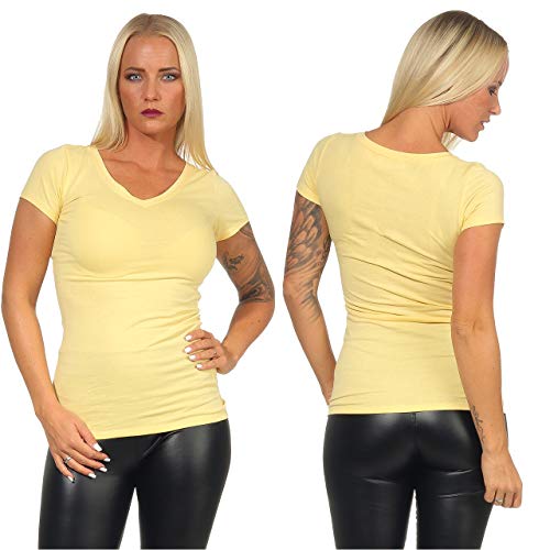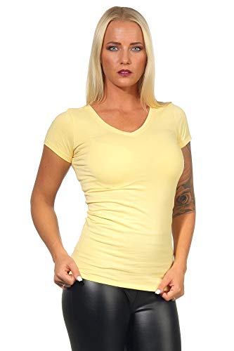 StyleLightOne - Maglietta basic da donna, a maniche lunghe, elasticizzata, a maniche corte, scollo rotondo, slim fit (36-42), Giallo (collo rotondo)., 46-48