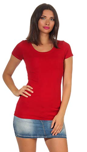 StyleLightOne - Maglietta basic da donna, a maniche lunghe, elasticizzata, a maniche corte, scollo rotondo, slim fit (36-42), Rosso scuro (collo rotondo)., 46-48