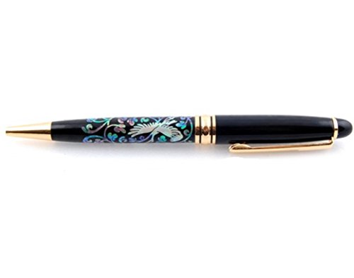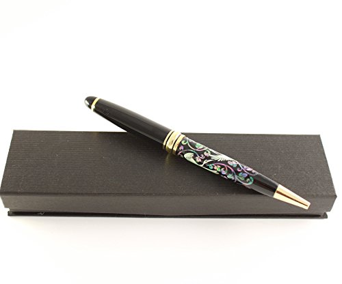 Bella penna a sfera decorata con naturale madre scintillante di perle intarsiate in motivo orientale - gru e fiori