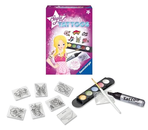 Contenuto: 6 timbri, porta timbri, marcatori tatuaggi, 5 vernici cosmetiche, pennelli per il trucco, istruzioni