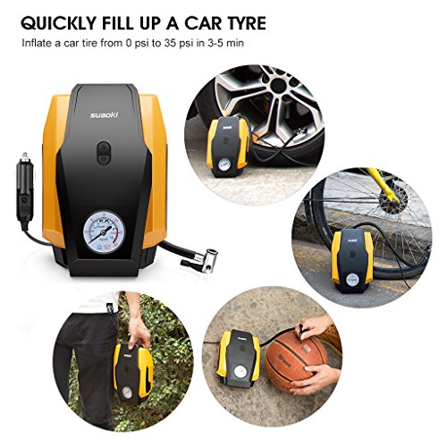 SUAOKI Compressore Aria Portatile 150 PSI Gonfiatore con Manometro 12V DC, Gonfiaggio Veloce 21L/Min, Torcia Incorporata, 4 unità, 3 Adattatori di Valvola per Pneumatici di Auto, Moto, Biciclette