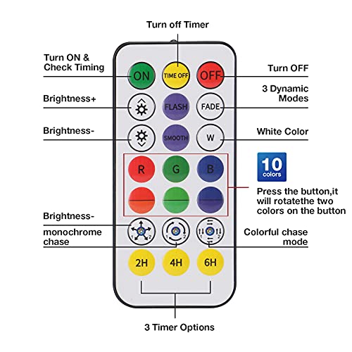 Ogni luce subacquea è dotata di un telecomando RF a 21 tasti. Offre 16 colori statici, 3 modalità di cambio dinamico, 4 funzioni di timing: 2h, 4h, 6h e timing. Il cambio di colore flessibile offre infinite possibilità per la decorazione della casa e altri luoghi.
