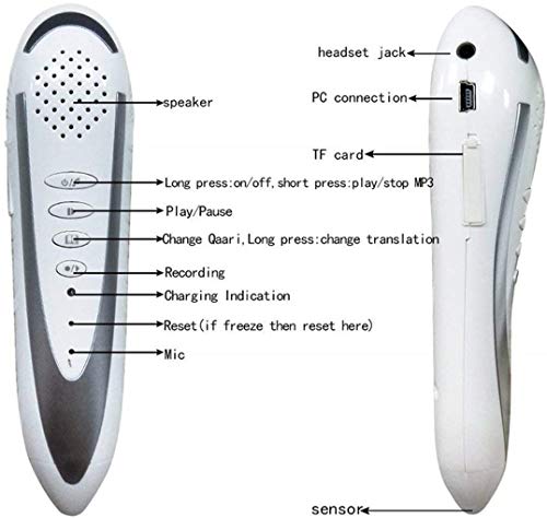 ☪ multifunzione: Quran penna di lettura in grado di leggere / Record / Repeat / e tradurre, completi recitazioni di voce del Santo Corano da parte di Al-Afasy, Abdul Basit, Ajmi, Aya e Al-Meaqli, liberamente passare fra i reciters e le traduzioni.lingua voci di default nella penna è l'arabo, inglese, urdu, francese e così via.
