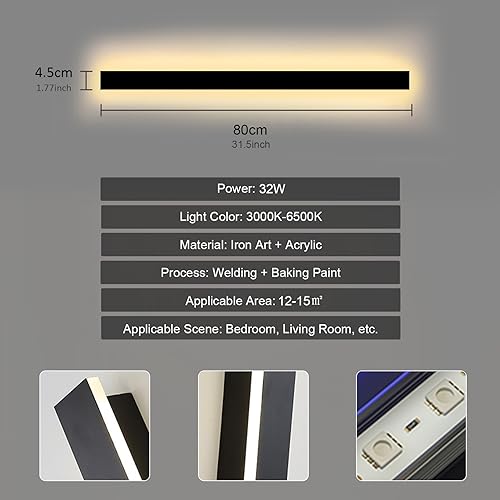 SUCIKORIO Applique da Parete Interno Lunga 80cm, Moderna 32W Lampada da Parete Alluminio Dimmerabile 5%-100% 3000K-6500K Lampada Muro Con Telecomando e APP per Soggiorno, Camera da Letto, Scala