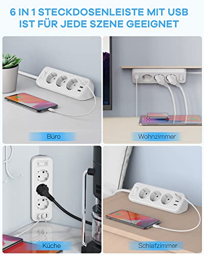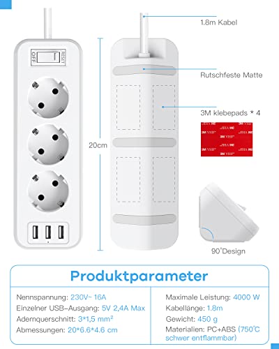 Sudeery - Ciabatta elettrica a 3 prese, con 3 USB, multiuso, con interruttore, protezione da sovraccarico con cavo di prolunga da 1,8 m, per cucina, colore: Bianco