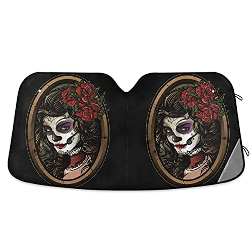 635 Sugarskull Girl Rose Parabrezza per Auto Parasole Teschio Fiori Rossi,Copertura Parabrezza Auto Pieghevole Maggior Parte dei Veicoli Parasole Anteriore Auto Mantiene L'Interno Fresco 130x70cm