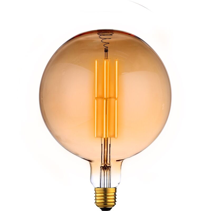 Lampadina decorativa G200 LED 12W (attacco E27). Realizzato in vetro ambrato e con filamento LED da 1400lm e luce bianca calda (2700K), regolabile nell'intensità luminosa (TRIAC). Grande formato, 20x20x26,2cm, perfetto per dare un tocco moderno a qualsiasi ambiente.