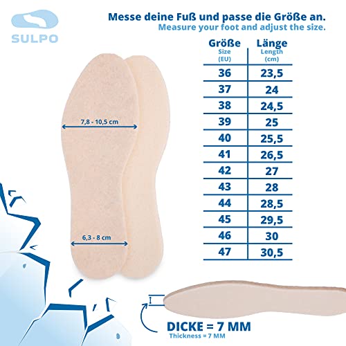 SULPO Solette Invernali in Lana di Pecora - Solette Termiche in Feltro extra-spesso, morbide e calde - 80% Lana, 20% Poliestere - Rigide e Durevoli per Scarpe Invernali - Taglia 36-47, Pacco da 2 paia