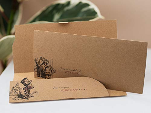 Questi biglietti d'invito a tema Alice nel paese delle meraviglie sono stampati su cartoncino premium da 250 g/m². È adatto a tutte le feste come addio al nubilato, feste di compleanno o persino baby shower.