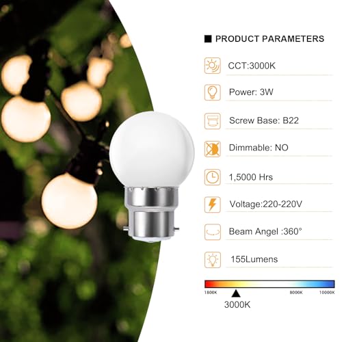 Risparmio energetico: con la lampadina LED G45 B22 da 3 W da 20 W, può risparmiare energia. Luce calda a basso consumo energetico, angolo del fascio: 360 gradi