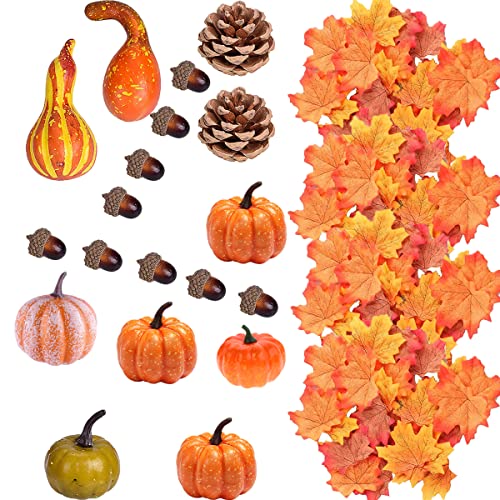 PACCHETTO - Ottieni 30 pezzi di foglie d'acero artificiali, 10 pezzi di ghiande, 8 pezzi di zucche di diverse forme, 2 pezzi di pigne. Il totale è di 50 pezzi. Con queste zucche decorative puoi trasformare la tua casa in una bellissima casa delle fiabe il giorno del Ringraziamento o Halloween.