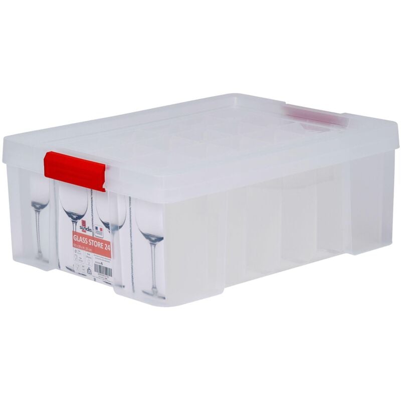 SUNDIS Glass Store, scatola portaoggetti da 27L in plastica trasparente, con 24 scomparti per riporre calici, rinforzata con coperchio a clip, pareti diritte, impilabili e combinabili