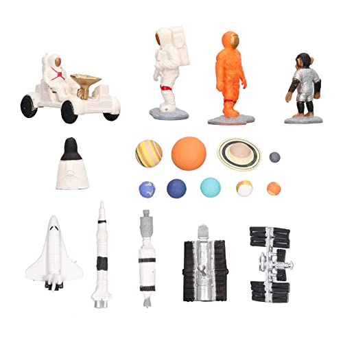 19 pezzi: questo set di modelli spaziali include 2 astronauti, 1 scimpanzé spaziale, 1 razzo, 1 aeroplano, 4 modelli spaziali, 1 rover lunare, 9 pianeti.