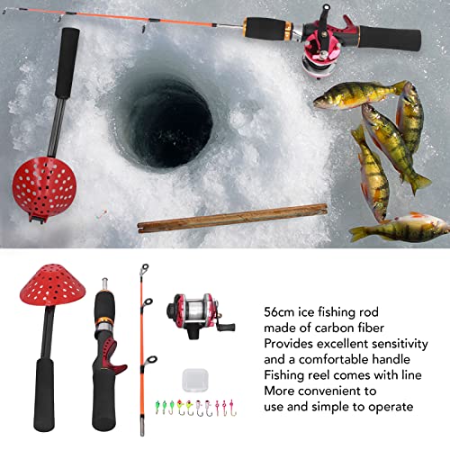 Set di attrezzi per la pesca sul ghiaccio: una combinazione di canne da pesca sul ghiaccio da 56 cm con prodotti per la pesca sul ghiaccio come mulinelli e ami per le tue possibilità di successo sul ghiaccio in questa stagione.
