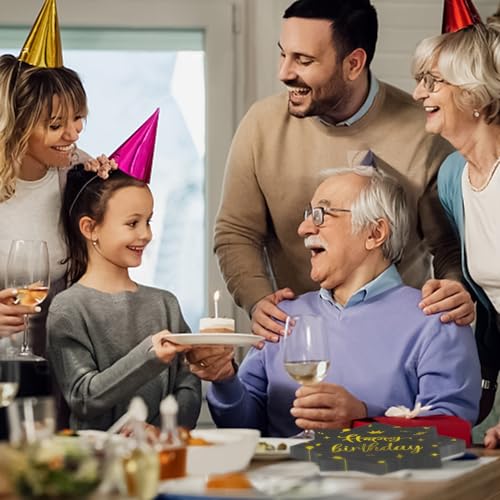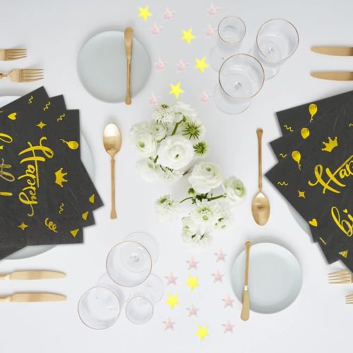 Sunhaty 40 Pezzi Happy Birthday Tovaglioli di Carta Neri Oro Tovaglioli di Buon Compleanno con Coriandoli 33 x 33 cm Tovaglioli Compleanno per Decorazione di Festa e Compleanni