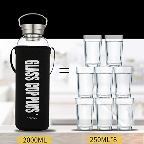 Sunkey Bottiglia Acqua 2 Litri in Vetro Borosilicato Trasparente Portatile Leakproof Tappo Manico Neoprene Custodia Bpa Free