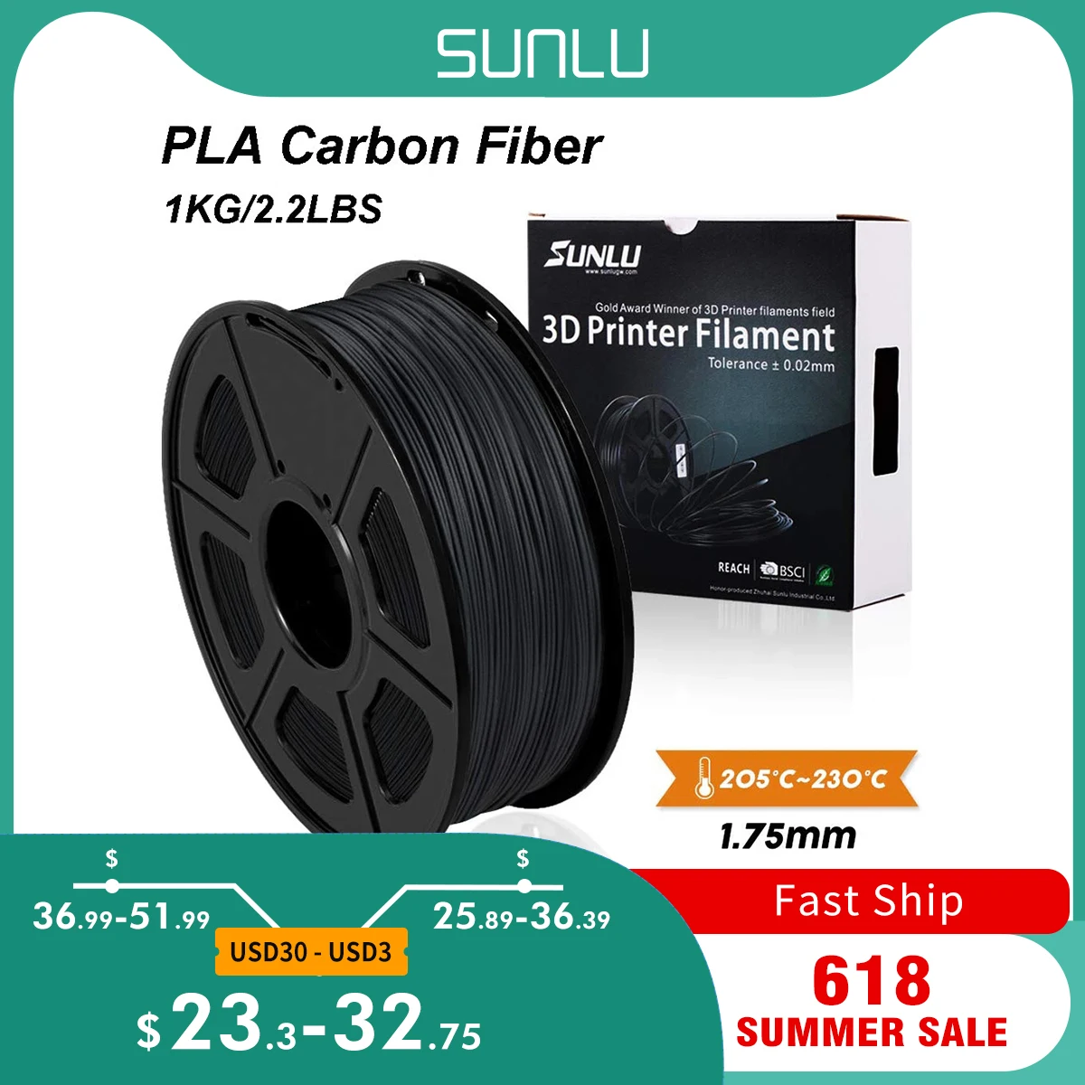 SUNLU PLA Carbon Fiber Premium 3D Printer Filament Extremely Rigid Carbon Fiber 1.75mm +/- 0.02mm 1 KG (2.2 lb)