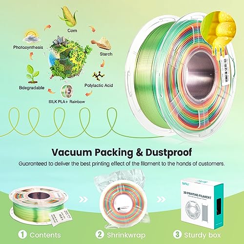 ③【Filamento di Alta Qualità per Stampa Liscia】Il filamento pla plus silk rainbow resistente di SUNLU ha una struttura liscia, estrusione liscia, forte adesione dello strato e buona adesione della lastra di costruzione, non si deforma, non ha odore, basso restringimento, e facile da stampare con una bella resa del colore e una finitura serica di alta qualità. Ottimo per la stampa di opere d'arte e artigianato di pregio.