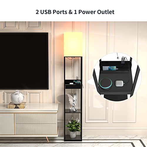 SUNMORY Lampada da Terra a Mensola con 3 Temperature di Colore, 2 Porte di Ricarica USB e 1 Cassetto, Lampade da Terra in Legno Massello per Camera Da Letto e Soggiorno, Nero(Lampadina Inclusa)