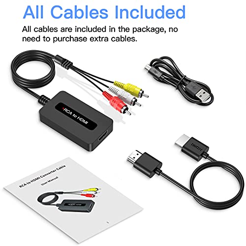 【Tutti i Cavi Inclusi】 Non è necessario acquistare cavi RCA o HDMI aggiuntivi. La confezione di questo convertitore da RCA a HDMI contiene: 1x adattatore RCA HDMI, 1 x cavo RCA, 1x cavo HDMI, 1 x cavo di alimentazione USB, 1 x manuale utente.