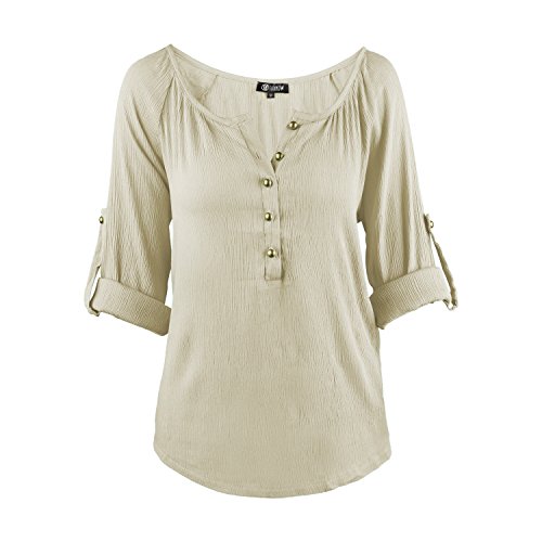 SUNNOW Nuova maglietta allentata della camicetta della maglietta del cotone lungo del manicotto del V-collo delle donne (M, Cachi)