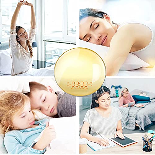【Sveglia la luce attraverso la simulazione dell'alba】: sveglia delicatamente la sveglia con simulazione dell'alba, 30 minuti prima dell'ora della sveglia, si accende gradualmente dal 20% di luminosità al 100%. Quando arriva il tempo di impostazione dell'allarme, con 7 tipi di musica sonora naturale, è possibile entrare facilmente in uno stato di sonno leggero.