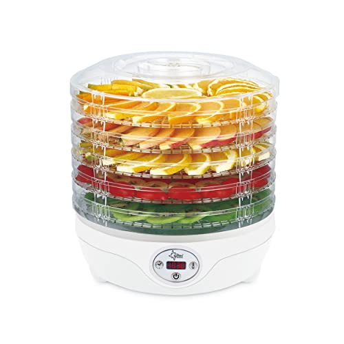 SUNTEC essiccatore per Alimenti con Timer - Piccolo e Rotondo per Frutta + Carne + Verdure - Set 5 Ripiani Senza BPA e 2 tappetini - Regolazione Termica 35-70 C° - 240 Watt - FDH-8595 Dörthe Digital
