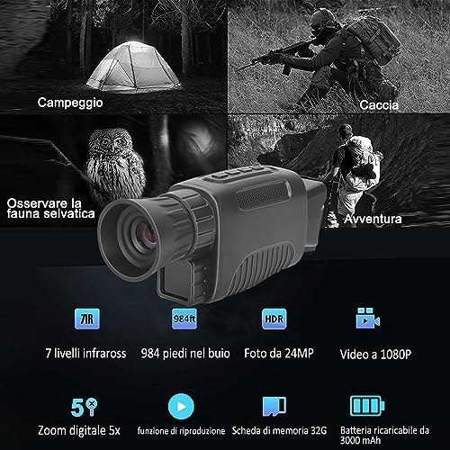 【Zoom Digitale 5x, 24MP 1080P】 il dispositivo per la monoculare visore notturno ha uno zoom digitale 5x e un'apertura di 25 mm, puoi facilmente regolare la migliore lunghezza focale in base alle tue preferenze per rendere i dettagli più chiari. Fornisci immagini da 24 MP e video nitidi da 1080P, che possono essere visualizzati direttamente attraverso lo schermo TFT da 1,5". ( Scheda di memoria 32G inclusa)