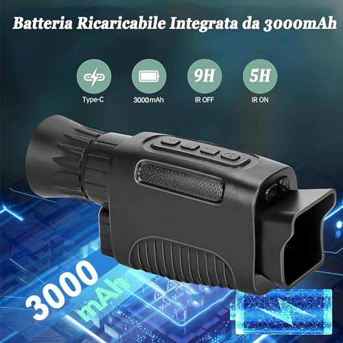 【Portatile e Batteria Ricaricabile da 3000 mAh】 il monocolo per la visione notturna pesa 190 grammi e può essere facilmente messo in tasca, rendendolo molto portatile. Batteria al litio integrata da 3000 mAh, lunga durata della batteria (interfaccia di tipo C). Ottimo per la caccia, il campeggio, la vela, la sorveglianza, le avventure all'aria aperta, l'osservazione degli animali, il birdwatching.