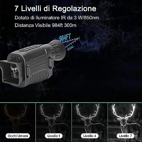 【Visione Notturna Chiara】 il LED IR da 3 W 850 nm integrato del dispositivo per la visione notturna monoculare consente di osservare chiaramente il bersaglio a una distanza fino a 300 m (immagine in bianco e nero) in un ambiente completamente buio. La luminosità a infrarossi regolabile su 7 livelli può fornire la migliore visibilità notturna (maggiore è l'impostazione IR, più chiara è l'immagine), offrendoti un'esperienza di utilizzo migliore.