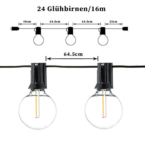 SUNTHIN Catena luminosa per esterni e interni, 2700 K, luce bianca calda, IP45, 16 m, con 24 lampadine G40 dimmerabili, con 1 lampadina di ricambio per balcone, giardino, festa, Natale, matrimonio