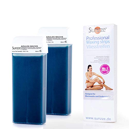 Sunzze, set di ricariche di cera calda, roll-on, azulene, per cera brasiliana, kit con cera per depilazione, 2 pezzi da 100 ml, con strisce in tessuto non tessuto