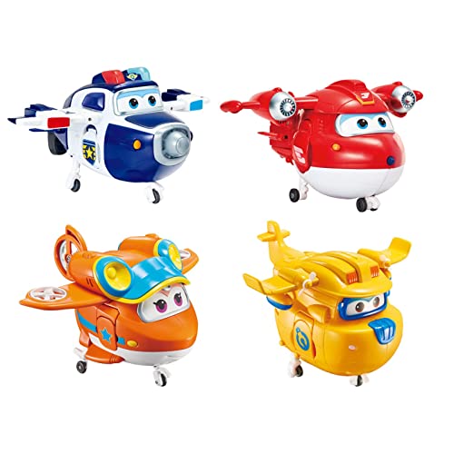 Super Wings Aereo Giocattolo - 4 Pezzi Transformers Giocattoli Robot Giocattolo, Macchinine Giocattolo per Bambini Regalo Bambina 3 4 5 6 Anni, Jett+ Paul+ Donnie+ Sunny, 12cm