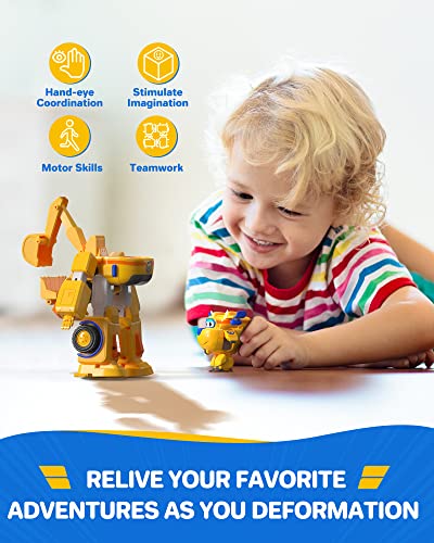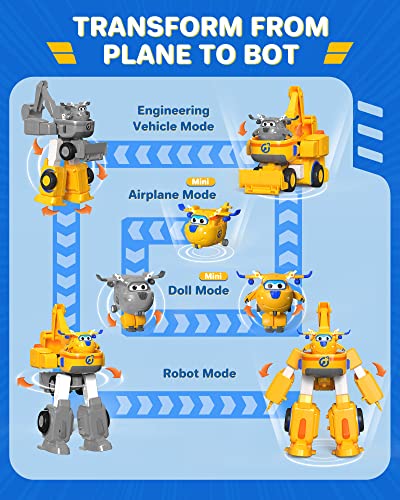 Tempo per un super aggiornamento! Questo set comprende due veicoli trasformanti: Donnie's Dozer come si vede nel prescolare Super Wings show e 2 pollici scala trasformando la figura Donnie.