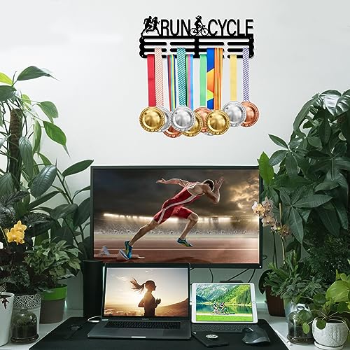 Run Cycle Medal Hanger: Caratterizzato da un motivo di ciclismo e corsa con testo Run Cycle, questo gancio per medaglie da noi è tutto progettato con cura e presenta un design senza ganci per un look più minimalista.