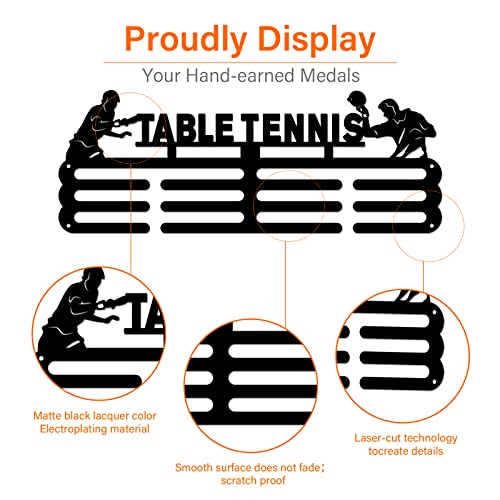 Espositore Medle da tennis: questo appendiabiti per medaglie è progettato con il tema del tennis, 2 giocatori stanno giocando a tennis, con le parole "Table Tennis". Ogni buon atleta che ha molte medaglie e ricompense da mostrare. Questo display per medaglie è un modo per mostrare le tue medaglie sul muro.