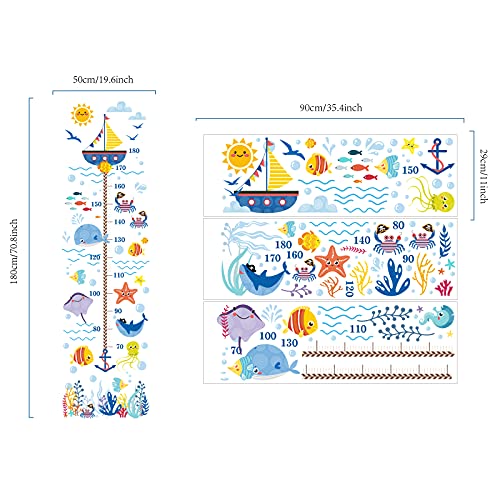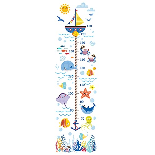 DESIGN CHIC: le decalcomanie da parete in PVC per la tabella dell'altezza per i membri della famiglia sono progettate con simpatici motivi di pesci dei cartoni animati per quanto riguarda il sottomarino, come le meduse, tartaruga di mare, stelle marine e delfini, che sono così adorabili e attraenti, trasformando la tua stanza in uno stile di decorazione affascinante e creativo.