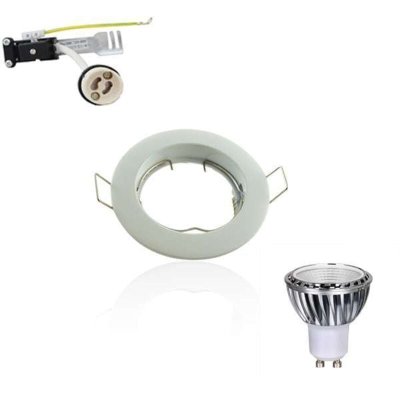 Kit spot LED GU10 da incasso con una potenza di 5W luce 50W dimmerabile. Questo kit tutto in uno include: un supporto spot fisso rotondo incassato + una presa in ceramica GU10 + lampadina LED GU10 5W COB - ombreggiatura bianca del giorno 6000K. Spot 62mm diametro di recesso. Supporto in alluminio bianco. 6000K 5W 50W 450 8 Un completo kit GU10 Questo set include una lampadina LED COB 5W dimmerabile 5W con illuminazione equivalente a 50W. Questo punto ha un angolo di illuminazione di 80° e una potenza luminosa di 450 lumen. Il bulbo è associato a una presa in ceramica bianca GU10 che consente il collegamento diretto alla rete di alimentazione 220V e un supporto spot da incasso rotondo per incassare la lampadina nel soffitto. Esempi di utilizzo e numero di spot Questo kit spot GU10 è molto utilizzato per le sale di illuminazione come soggiorno, sala da pranzo, cucina o bagno. In termini di densità spot, si consiglia un posto per 2 a 3m2 per ottenere una buona illuminazione nei