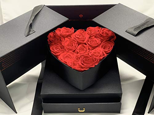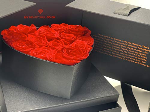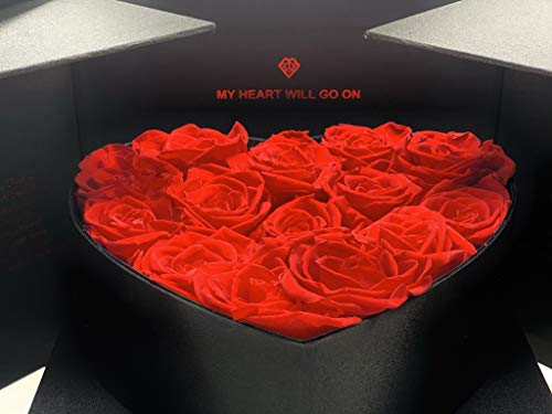 Idea regalo originale: Decora la tua casa, il tuo ufficio o qualsiasi spazio con fiori stabilizzati che durano per anni e rimangono uguali fin dal primo giorno. Presentate in scatola nera con aperture laterali e laccetto. Include un cofanetto per sorprendere ancora di più la persona amata (biglietto d'amore, petali, anello di fidanzamento, ecc.). Un regalo unico e originale. Include la scritta incisa “My Heart will go on” all'interno della scatola, che una volta aperta sorprende con la sua bellezza unica.