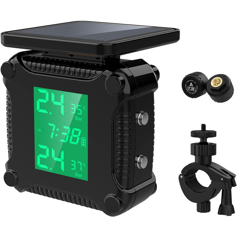 Caratteristiche: Ricarica solare e USB, Viene adottato il design di ricarica magnetica, che può essere assorbito in un secondo e può essere caricato rapidamente, Due metodi di ricarica garantiscono una maggiore efficienza di ricarica. Segnale wireless stabile e tempestivo. Design impermeabile e antipolvere, adatto a vari ambienti. Il monitor per pneumatici per auto ha uno schermo digitale grandangolare LCD con retroilluminazione brillante e dati chiari, sia di giorno che di notte, puoi leggere facilmente i dati. Batteria incorporata da 400 mAh, Tempo impostabile. Allarme di alta pressione, allarme di pressione inferiore, allarme di alta temperatura, allarme di perdita di pneumatici veloce. Valore di allarme di pressione regolabile, adatto a due ruote di diversi modelli. Specifiche: Colore LCD: arancione, verde per opzionale Precisione della pressione del sensore: ± 0,1 bar (1,5 psi) Modello batteria sensore: CR1632, sensore sostituibile Formato del pacchetto: 16*14*5 cm Peso della