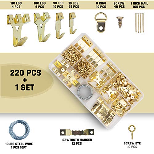 Supplygenix Kit completo per appendere quadri (220 pezzi) con strumento per appendere quadri con mini livello, ganci per quadri, chiodi, filo da appendere, telaio e martello set