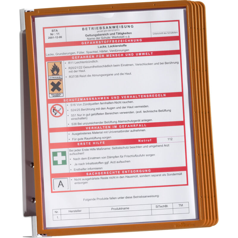 Supporto a muro in metallo da avvitare. Con 5 pannelli di visualizzazione di formato DIN/A4 in PP, adatti per documenti ufficiali e per scansioni. Uso: Facile sostituzione dei documenti mediante meccanismo a perno. Fornitura: Incluso materiale di fissaggio. Dati tecnici Adatto soprattutto per carta di formato DIN A4 Tipo di prodotto Supporto a muro per pannelli di visualizzazione Colore arancione Materiale di montaggio fornito in dotazione sì Tipo di fissaggio avvitabili Numero di pannelli di visualizzazione 5 Materiale pannello di visualizzazione Polipropilene Materiale supporto Metallo Per documenti sì Per scansioni sì