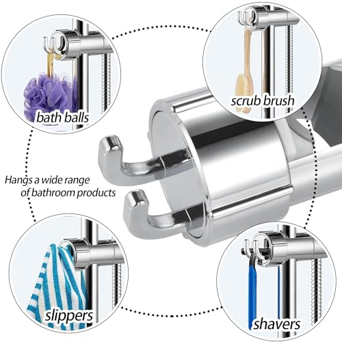 【Stabile e Durevole】Il supporto è realizzato in ABS di alta qualità, dotato di un rivestimento cromato durevole, antigraffio e resistente alla corrosione. Il supporto per asta doccia con 2 ganci su cui possono essere appesi asciugamani, palline, rasoi, spugne, spazzole da bagno e altri accessori da bagno.