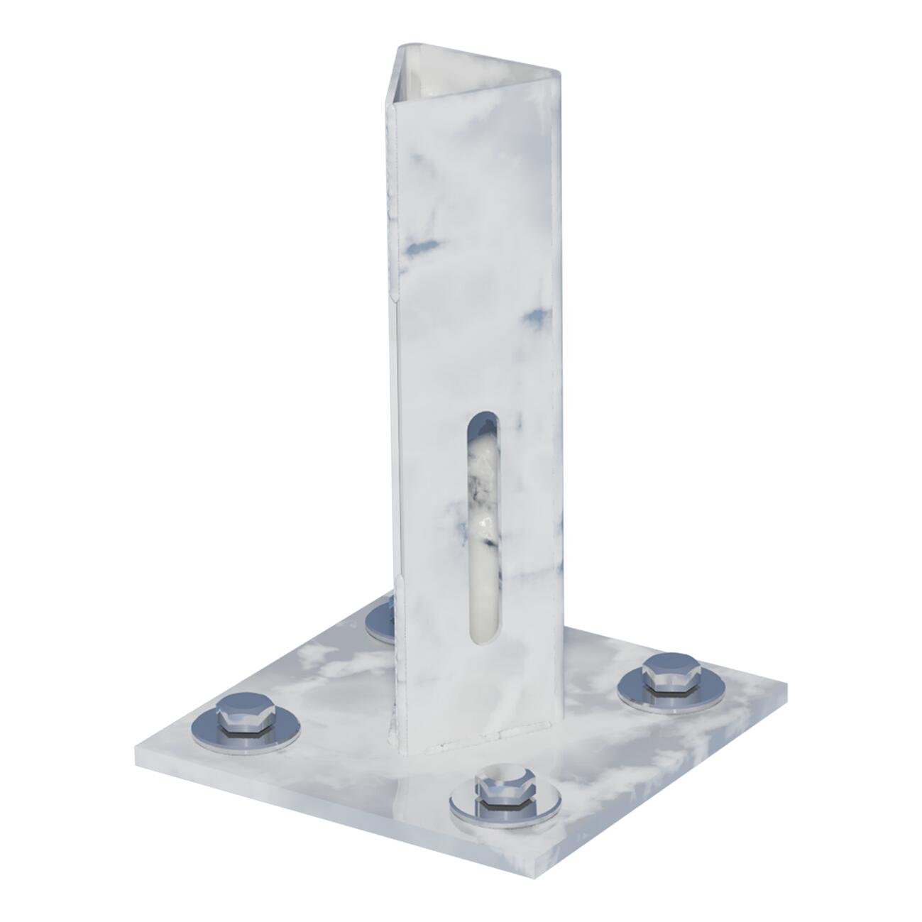 Supporto metallico per palo a “T” 30x30 mm per la posa di reti metalliche su muretto o cordolo in calcestruzzo. Realizzato con acciaio zincato a caldo per immersione. Il supporto è provvisto di fori per il fissaggio al muretto con bulloni ad espansione (non forniti nella scatola). Dimensioni della piastra 100x100 mm. Altezza del supporto 150 mm.. Indispensabile per la posa dei pali a T su muretto di cemento, senza bisogno di realizzare fori nel cemento. L'installazione tramite supporti garantisce una posa più rapida, con conseguente riduzione dei costi relativi a manodopera e materiale. Gli spessori elevati della base e l'energica saldatura del profilo assicurano la robustezza necessaria per garantire la tenuta della recinzione. Il supporto è fornito con una vite autoperforante a corredo per il fissaggio del palo al supporto. La zincatura a caldo per immersione garantisce un alto grado di qualità ed un'elevata durata nel tempo